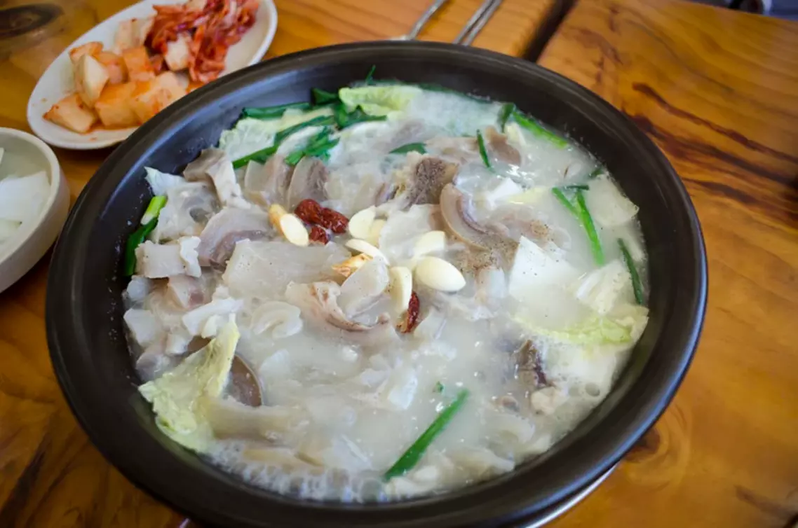 冬天最適合來上一碗「雪濃湯」,據說這是古時皇上和百姓祈求年度豐收祭典後,都會食用的料理,有別於上面介紹的「馬鈴薯排骨湯」,這道韓國美食是以牛為主角,用牛骨、牛肉及牛內臟一起長時間熬煮,直到熬出雪白色的湯頭,喝起來有濃郁牛香氣,卻不會有牛的腥羶味,滑順不膩口,而且富有膠原蛋白,女生喝了可養顏美容,當然也富含胺基酸及鈣質,適合消化不佳或體虛者,韓國人會把白飯加入湯中做成湯泡飯享用,並依個人口味酌量加入鹽巴、胡椒粉等。