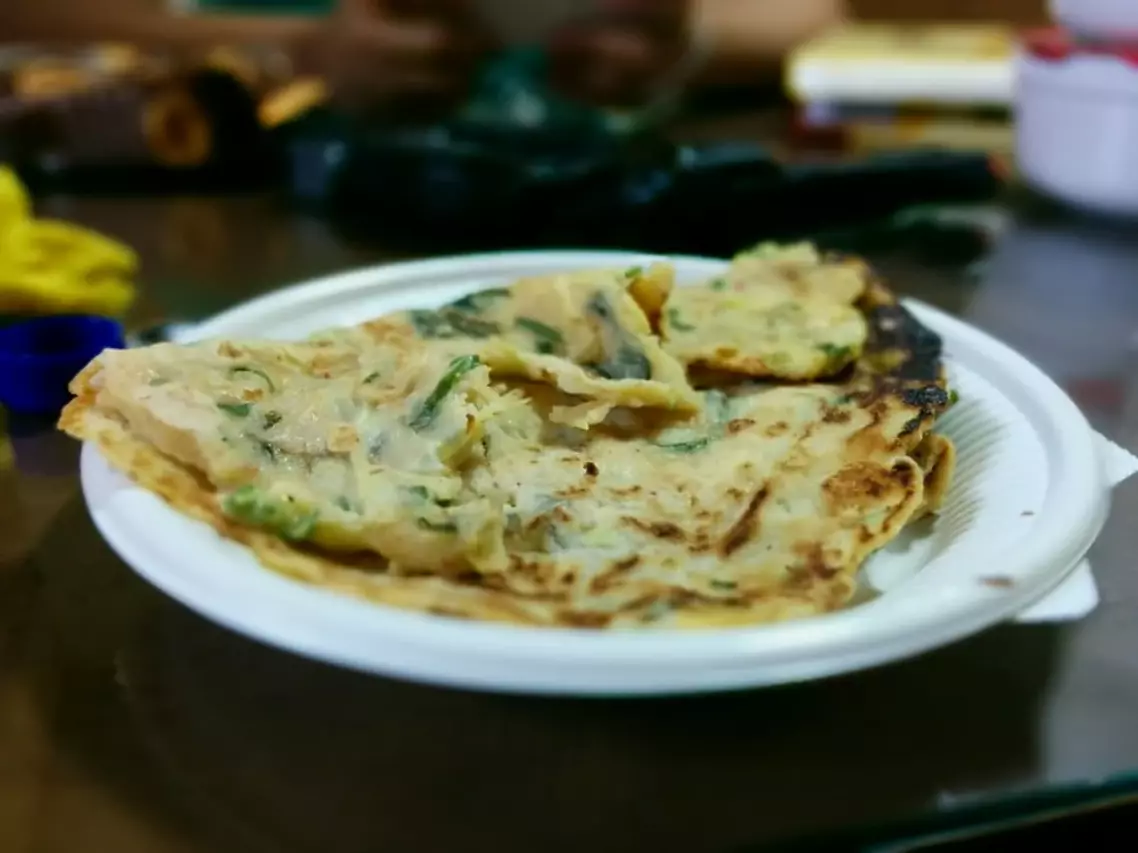 號稱韓國披薩的「韓式煎餅」,是由麵粉、小麥粉、糯米粉或玉米粉加雞蛋和水混合成麵糊,並放入紅蘿蔔、蔥、韭菜、洋蔥等配料,在平底鍋用油煎熟,切塊盛盤,如果加上各式海鮮就稱之「海鮮煎餅」;加入泡菜就成了「泡菜煎餅」,有點厚度又酥脆是最好吃的,而酥脆的祕訣就在於火候,以及最後必須放在網架上瀝乾水份,目前也越來越多創意發揮在韓式煎餅中,而這道料理據傳是媽媽為了安撫哭鬧的孩子,將冰箱僅有的食材,做出的金黃焦香零食,不得不說這靈機一動果然不是蓋的!