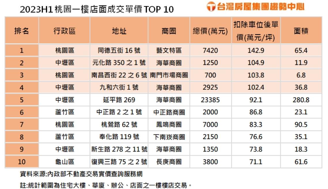台灣房屋趨勢中心執行長張旭嵐表示,觀察去年桃園前十名店面交易,單價都維持在七字頭以上水準,單價破百萬的店面同樣維持在四間,顯示疫後商圈店面交易狀況逐漸恢復穩定。而去年桃園店王單價為150萬,雖然今年上半年尚未超越,不過隨著國內消費回溫,後勢可期。