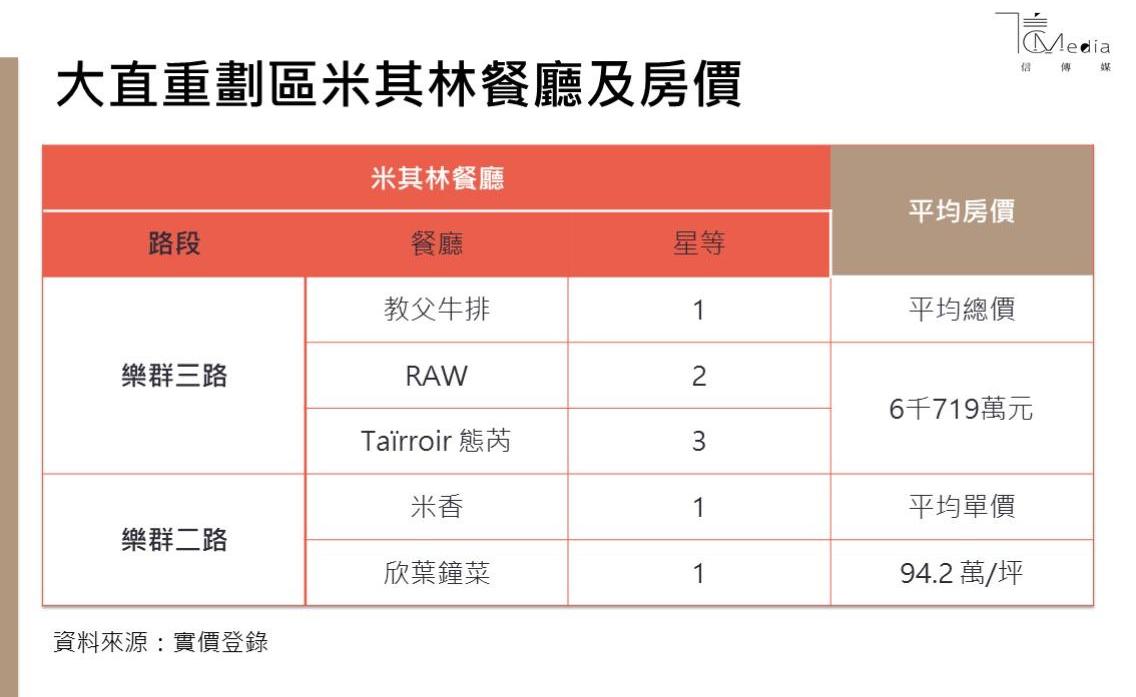 大家房屋企劃研究室總監郎美囡表示,大直重劃區豪宅林立,平均家戶所得高,在地消費力強,僅1公里長的樂群三路上就有3家米其林餐廳,共奪6星。