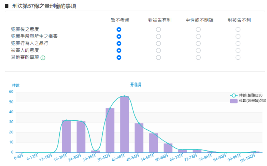 評價型模式則是從判決說明中的量刑審酌事由,歸納係說明刑法第57條哪一款的量刑審酌事由,並研判係屬對被告有利、對被告不利或中性的量刑因子,並進行歸納整理,使用者可以用個案的量刑情狀進行查詢。此模式的犯罪類型包括槍砲案件、毒品案件、妨害性自主案件。