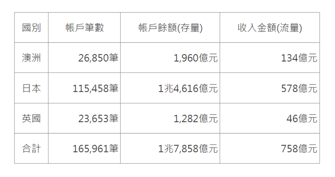 根據統計資料,澳日英三國之帳戶筆數皆在111年度增長,然帳戶餘額(存量)與收入金額(流量)年減率則分別為14.81%、35.85%。其中英國3項目皆增加,與澳洲、日本不同調。國際財政司副司長李明機表示,初步來看,原因與總體經濟環境並沒有完全正相關,「會針對比較大額的異常部分會請國稅局深入調查」。