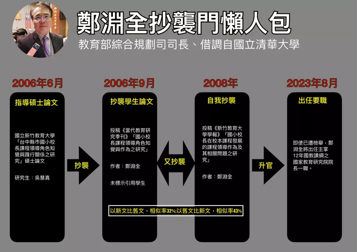 不過,鄭淵全在8月初即遭指控在任教於國立新竹教育大學時,期刊論文涉抄襲吳姓碩士論文,且有一稿多投情形,當時他回應,擔任新竹師範學院附設小學校長期間得到很多課程領導的經驗,也一直以此作為研究主軸,是學生跟著他學習,不是學生做了這個題目,才去發表文章。