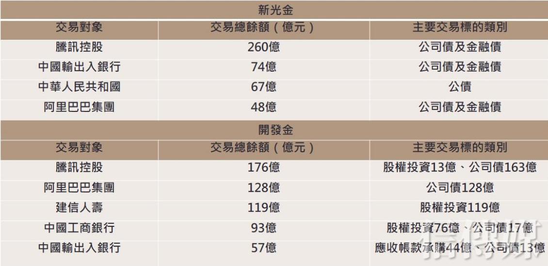 至於民營企業,五大壽險金控皆持有中國科技巨擘騰訊的股票或債券,其中,新光金持有騰訊控股部位260億元最多、其次是國泰金202億元、開發金持有176億、中信金也持有114億元,持有騰訊部位最低的是富邦金,截至今年第二季底為止,部位約為37億元;另外,阿里巴巴也有入榜國內壽險金控的30億元以上大額交易,其中又以開發金持債128億元最多。