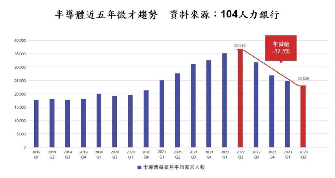 晉麗明分析,2021至2022年晶片需求大爆發,半導體業容光煥發,但2022年下半年開始,隨著終端電子品需求減降,半導體大廠陸續傳出拋售晶片、以及調節營運等消息,半導體產業暫時進入調整階段,徵才動能下滑。
