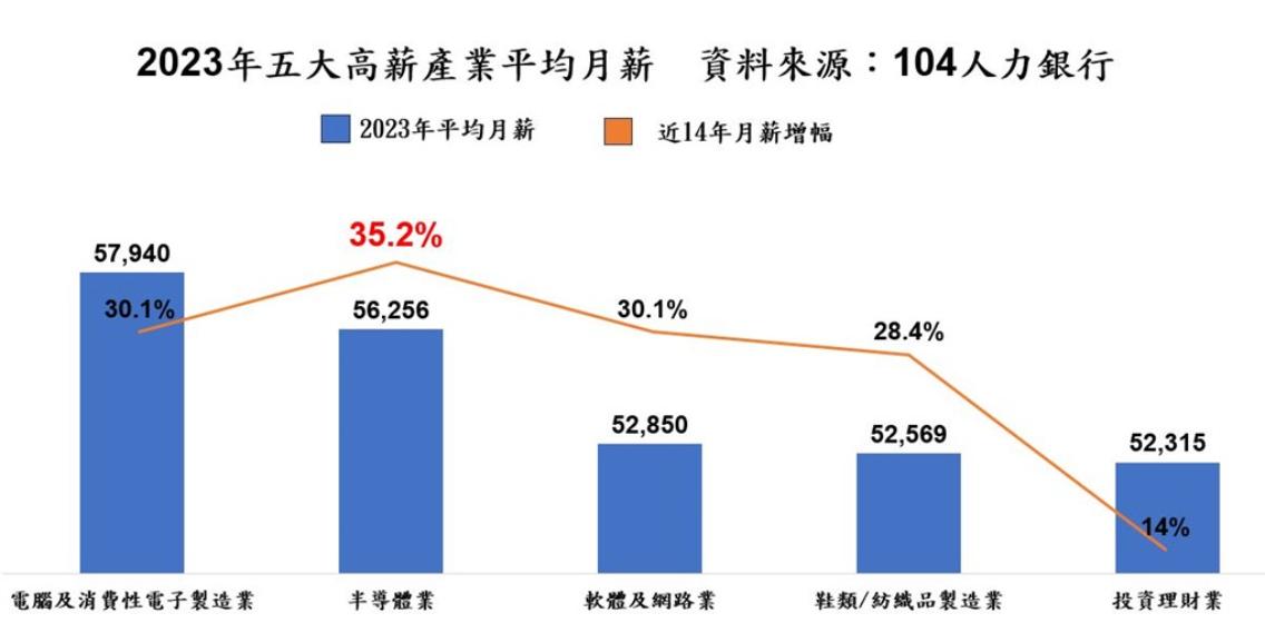 在薪資方面,半導體產業技術人才含金量高、缺工壓力仍高於整體就業市場,即使產業逆風,與2022年相比,平均月薪仍增加3.1%;看長期趨勢,2010年至2023年,半導體薪資累計增幅達35.2%,居五大高薪產業之冠。