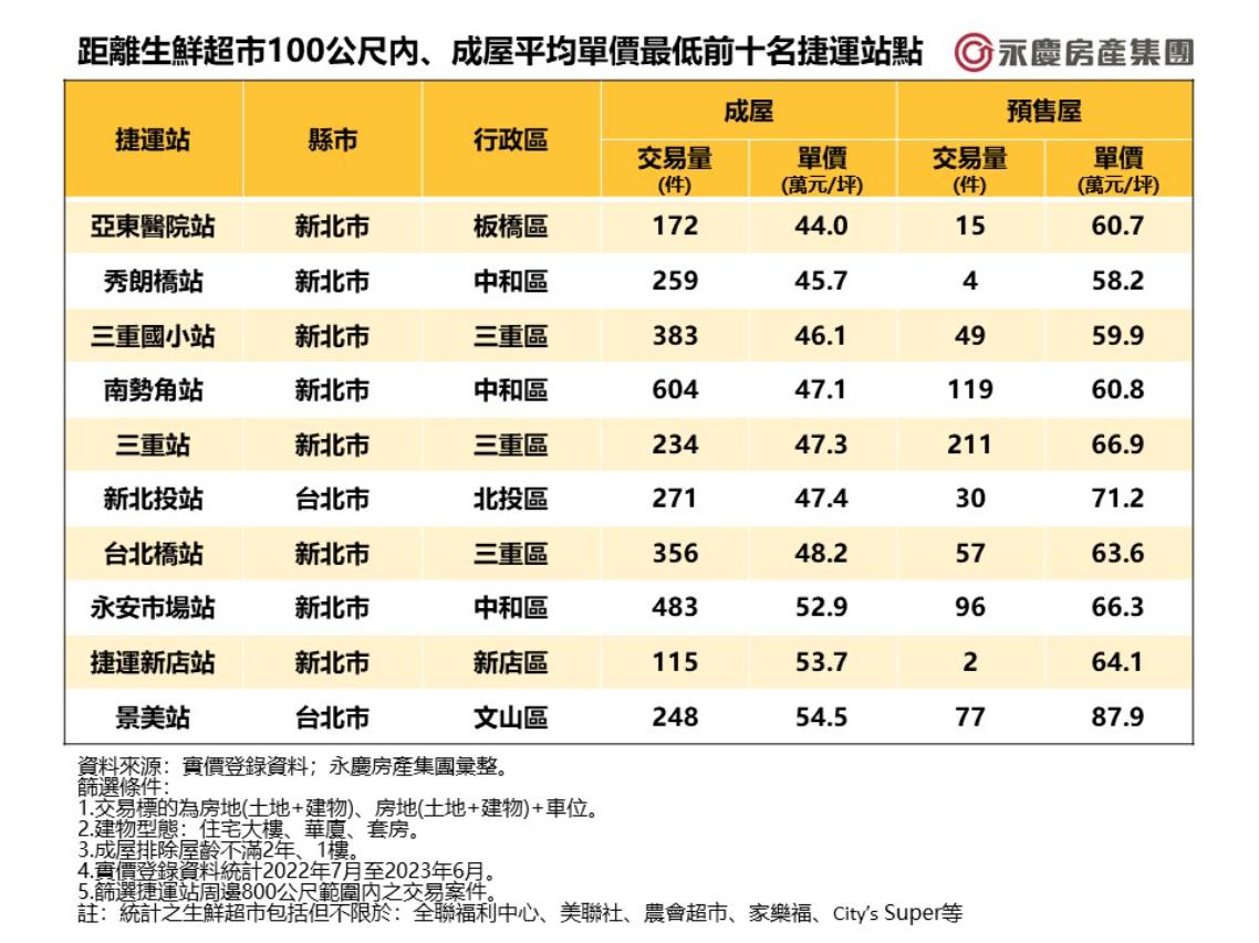 永慶房屋統計距離生鮮超市100公尺內、成屋平均單價最低的前十名捷運站點,發現亞東醫院站以平均單價44萬元價格最實惠,而南勢角站交易量最熱絡,近一年成屋和預售屋交易高達723件。