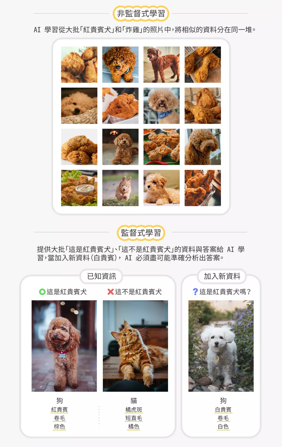 AI 的學習方法主要分為「非監督式學習」、「監督式學習」。非監督式學習是將大批資料提供給 AI,讓其根據工程師所定義的資料相似度算法,逐漸學會將相似資料分在同一堆,再由人類檢視並標注每堆資料對應的類別,進而產生監督式學習所需的訓練資料。而監督式學習則是將大批「資料」和「答案」提供給 AI,讓其逐漸學會將任意資料對應到正確答案。