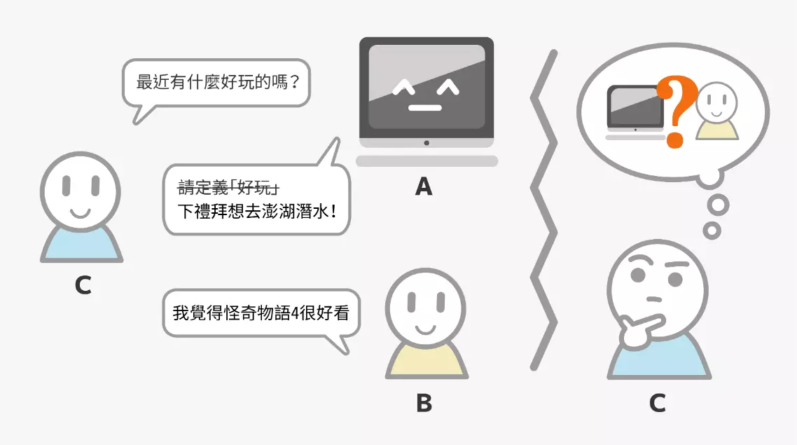 蔡宗翰研究員以今日常見的語音辨識系統為例,大家可以試著對 Siri、Line 或 Google 上的語音辨識系統講一句話,你會發現自己無法事先知曉將產生什麼文字或回應,結果可能正是你想要的、也可能牛頭不對馬嘴。此現象點出 AI 與一般數位工具最明顯的不同:AI 無法百分之百正確!