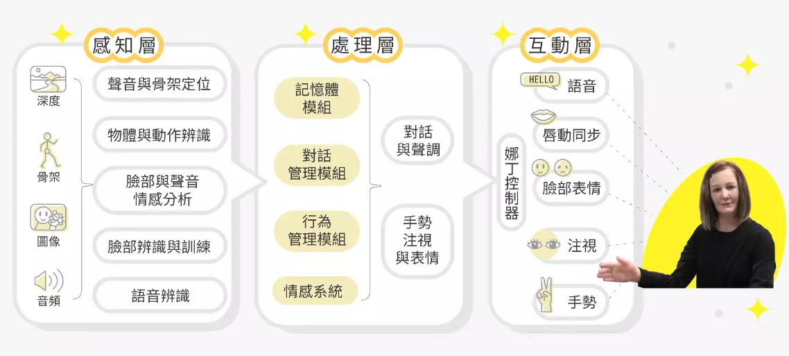 長照機構的高齡住戶多數因身心因素、長期缺乏聊天對象,或對陌生事物感到不安,常選擇靜默不語,需要照護者主動引導。因此,娜丁內建了注視追蹤模型,當偵測到住戶已長時間處於被動狀態,就會自動發起話題。