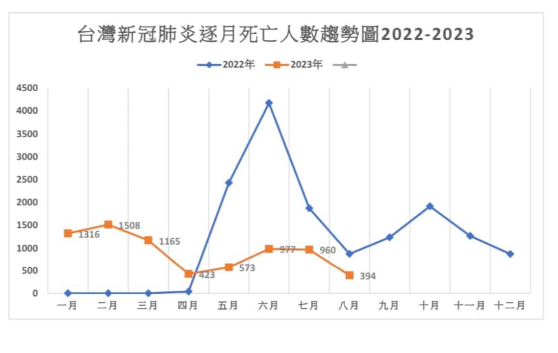台灣今年1月至今是新冠肺炎、流行性感冒和登革熱3種病毒性傳染病交叉重疊流行的地方,新冠肺炎從年初開始已經連續流行8個月,到8月底已經造成7,316新冠死亡案例,平均每日約有30個新冠死亡案例,但是比去年2022年1月到8月的前8個月的9,358新冠死亡案例少了2,042案例。