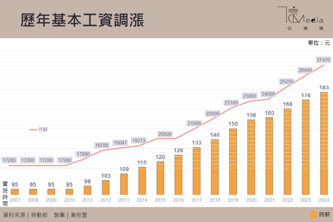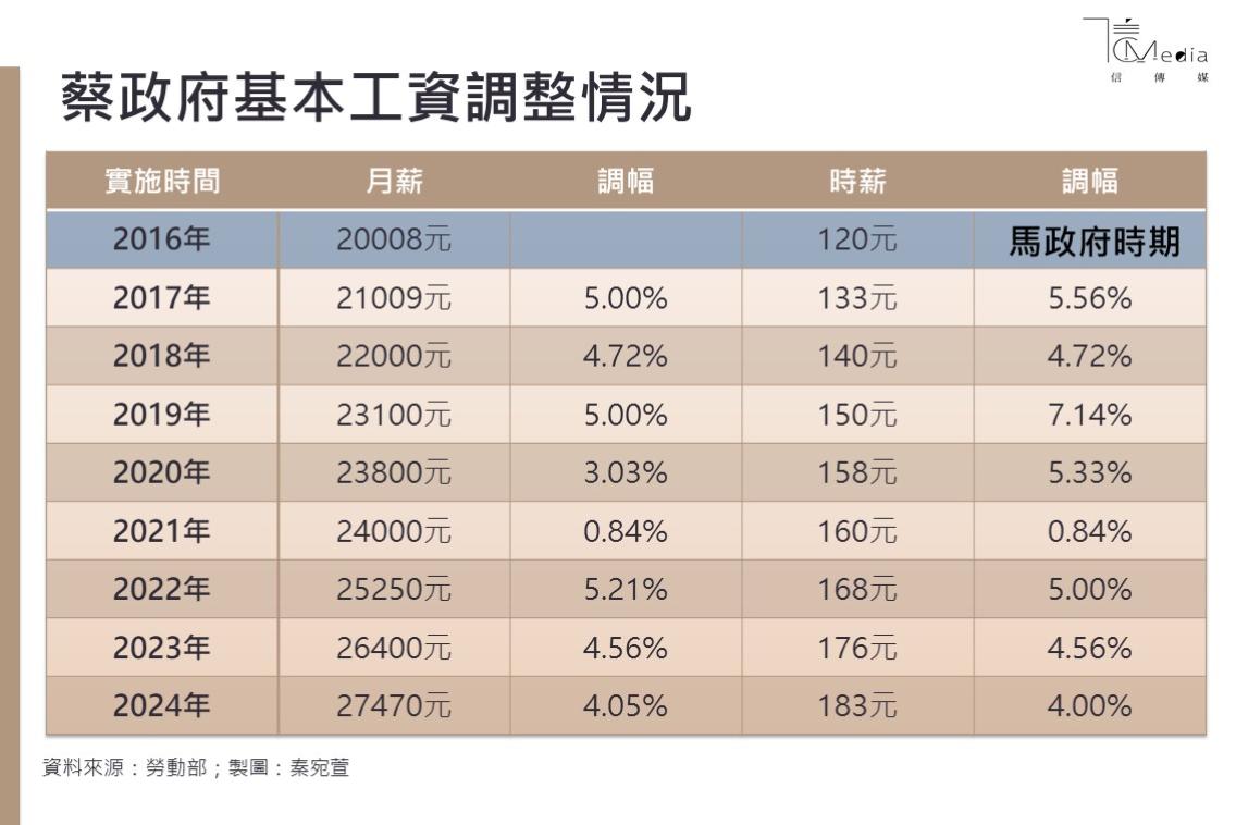 這次是總統蔡英文任期內,基本工資月薪將有8次調整,由上任前之20008元提升到27470元,總調幅約37.3%;時薪調整9次,由120元提升到183元,總調幅為52.5%。