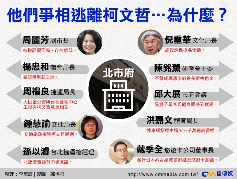 「下一個閃辭的,可能就是柯文哲自己。」看著北市府首長一個接一個請辭,目不暇給的新聞界於是給柯文哲開了這麼個玩笑;不過,下一個又會是誰?何時會辭職?柯市府團隊的離職率如此之高,柯文哲的個人作風有問題已不待言,但總是有個外力來推波,究竟是什麼?