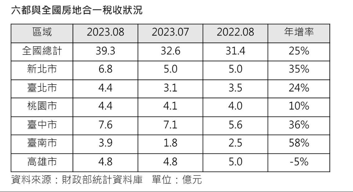 統計顯示,今年前8月平均單月稅收為28.5億元,8月稅收為39.3億元,創下今年單月新高,且年增幅度達到25%。若以各區域來看,房市熱區的台中市仍是8月的稅收王,台中市8月房地合一稅收7.6億元,年增36%,新北則是6.8億元,年增35%,台北市與桃園市都是4.4億元,台南市則也有3.9億元,高雄市4.8億元。