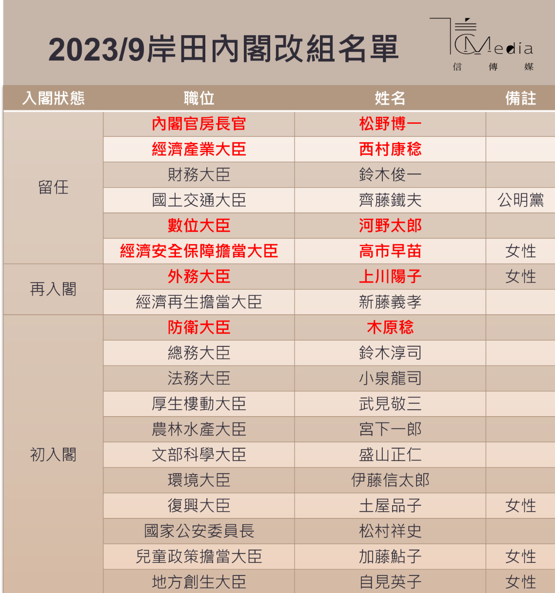 日本首相岸田文雄13日第二度進行內閣大改組,19名大臣中有13人遭到撤換,僅6人留任、11人是首次入閣,其中防衛大臣由54歲「友台派」議員木原稔出任,70歲的上川陽子則成為日本史上第三位女性外務大臣。