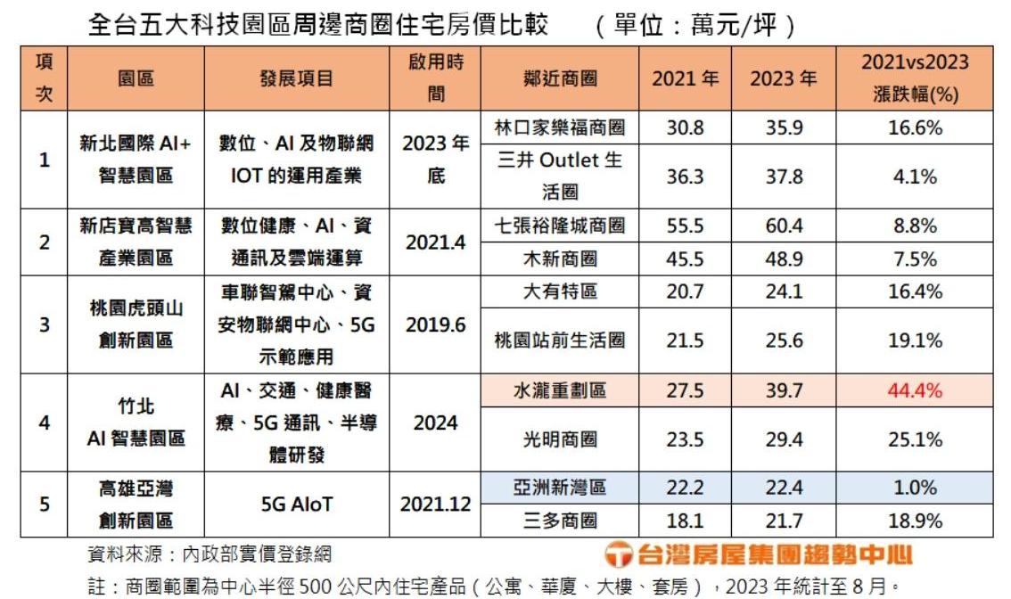 台灣是國際認證的科技島,受惠於設廠議題,全台五大科技園區周邊房市跟著受惠!台灣房屋趨勢中心統計實價登錄,近3年全台由官方主辦的五大AI科技園區周邊商圈的住宅房價,房價漲幅最高的是「竹北AI智慧園區」旁的水瀧重劃區,均價39.7萬,跟三年前相比房價上漲44.4%;而最親民的則是「高雄亞灣5G AIOT創新園區」附近的三多商圈,均價21.7萬元,三年房價微幅上漲18.9%。