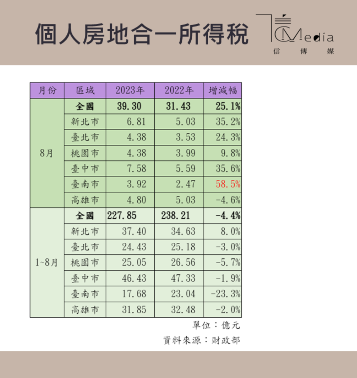 今年1~8月全國合計稅收227.85億元、年減4.4%,雖然總量仍低於去年同期,但今年上半年稅收合計155.98億元,年減幅高達10.4%,顯示今年第三季開始成交價量有進展,雖然今年1~8月稅收跟去年同期比較為下跌,但年減幅逐漸收斂,觀察單月稅收有增溫跡象,台南市今年1~8月個人房地合一稅收17.68億元,跟去年同期比重跌23.3%,不過8月創單月新高,房地合一稅收王依然由台中市擔當,8月稅收7.58億元、年增35.6%,高雄市為六都中,唯一8月份的房地合一稅收比去年少的區域,8月稅收4.8億元與7月份相當,比去年8月低4.6%。