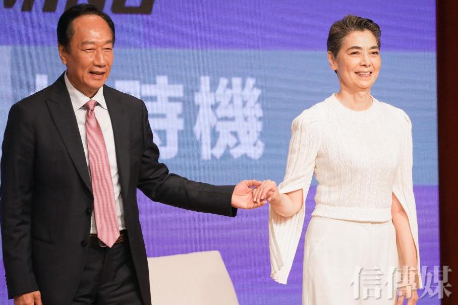 鴻海集團創辦人、2024總統擬參選人郭台銘今(14)早在張榮發基金會召開記者會,公布副手為在政治幕僚職人劇《人選之人—造浪者》中飾演總統候選人林月真一角的資深藝人賴佩霞,記者會除了有約100名郭粉到場,郭台銘妻子曾馨瑩、台大財金系教授陳嫦芬也出席相挺。