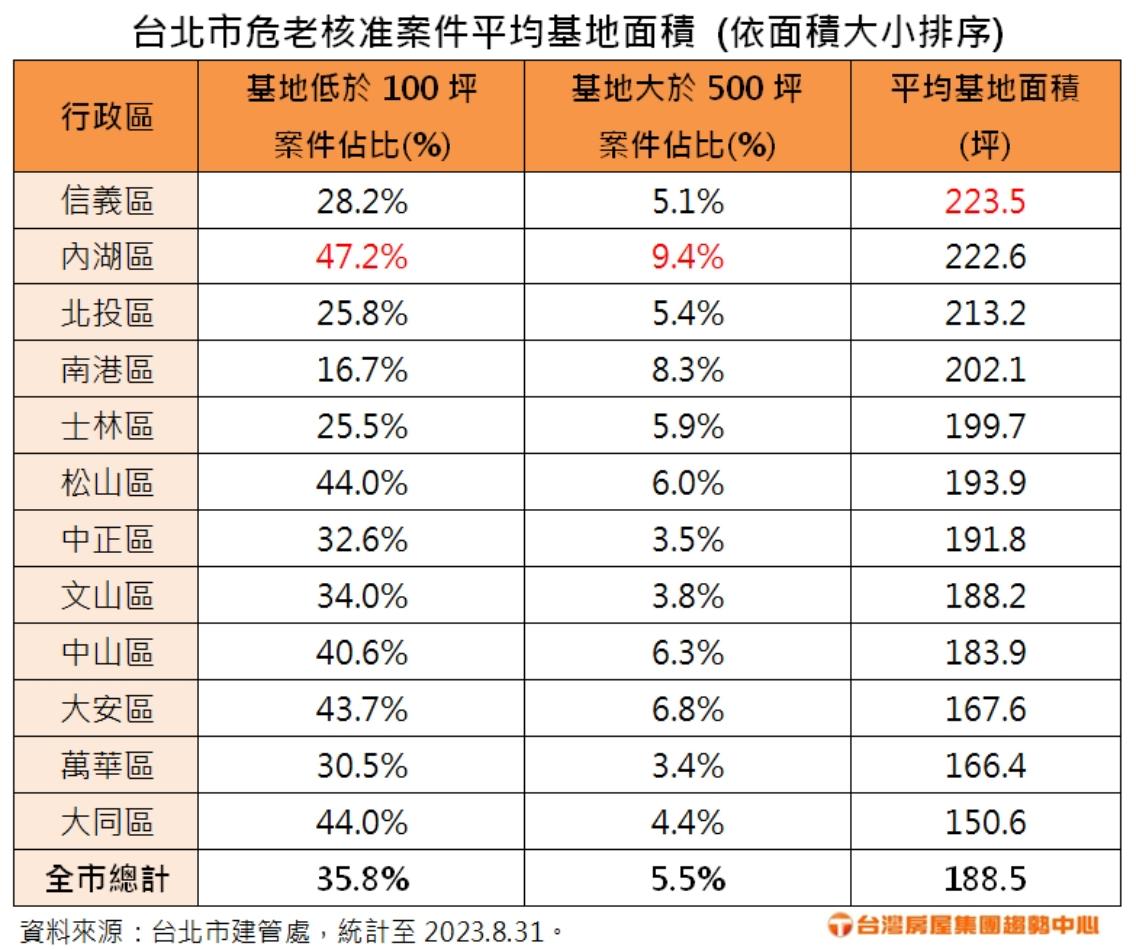台灣房屋彙整台北市建管處資料統計,北市危老核准案件各區的平均基地面積,最大的為信義區,平均223.5坪;最小的大同區,平均150.6坪;而全市平均僅188.5坪,其中基地未達百坪的案件,佔比高達35.8%,等於每三件有一件「危老小案」。