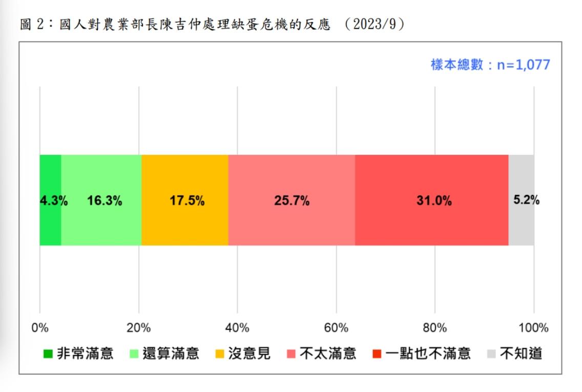 民調提問「農業部長陳吉仲最近(傳出想)請辭下台。一般說來,您對他近期處理缺蛋危機的整體表現,滿不滿意?」結果發現,4.3%非常滿意、16.3%還算滿意、25.7%不太滿意、31%一點也不滿意、17.5%沒意見、5.2%不知道、拒答。