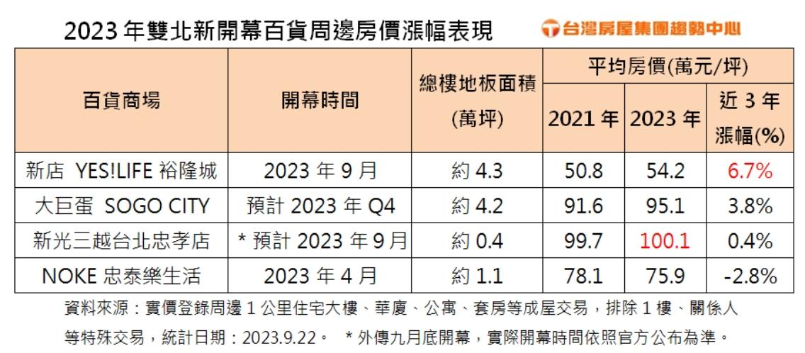 漲幅亞軍是預計最快在Q4分區開幕的大巨蛋SOGO CITY,近3年房價從91.6萬元漲至95.1萬元,漲幅約3.8%;東區「Diamond Towers 台北之星」的新光三越,雖僅上漲0.4%,但單價已突破百萬元大關,身價在4大新百貨中居冠!唯一下修的是4月開幕的大直NOKE忠泰樂生活,周邊均價比2021年微幅下滑2.8%。