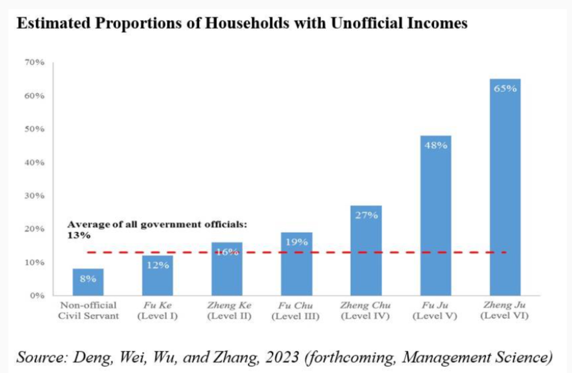 為了解中國屬於哪種情境,我們估算了特定行政級別官員「可能擁有非官方收入」的比例。透過比較有和沒有官員的家庭購入房產的價值,我們發現在我們抽取的樣本中有13%官員擁有非官方收入。重要的是,這一比例也隨官階提高而增加。例如我們的資料顯示,非管理職公務員僅8%獲得未揭露的可觀收入,相較之下,基層官員這一比例為12%,而正處、正局級官員分別為27%、65%。