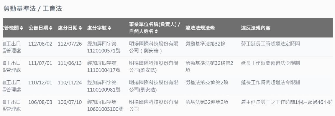 不過,而如今該起爆炸事件也讓明揚國際的黑歷史被人挖出,根據勞動部違反勞動法令事業單位(雇主)查詢系統的資料顯示,明揚從2017年8月至今共有4次因違反勞基法被裁罰,近3年更是每年都遭罰,主要原因都是延長工作時間超過法令限制,2021被罰5萬、2022年被罰10萬;最新一次則是在今年的8月,同樣也因勞工延長工時超過法定時間而違法勞基法,被加工出口區管理處開罰15萬。