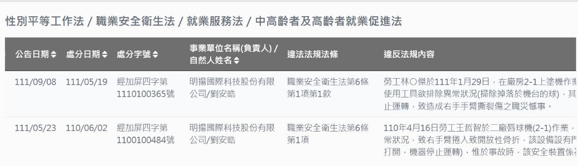 同時,2021、2022年明揚也分別因為勞工發生右手手臂撕裂傷、右手臂捲入致開放性骨折等職災憾事違反職業安全衛生法。