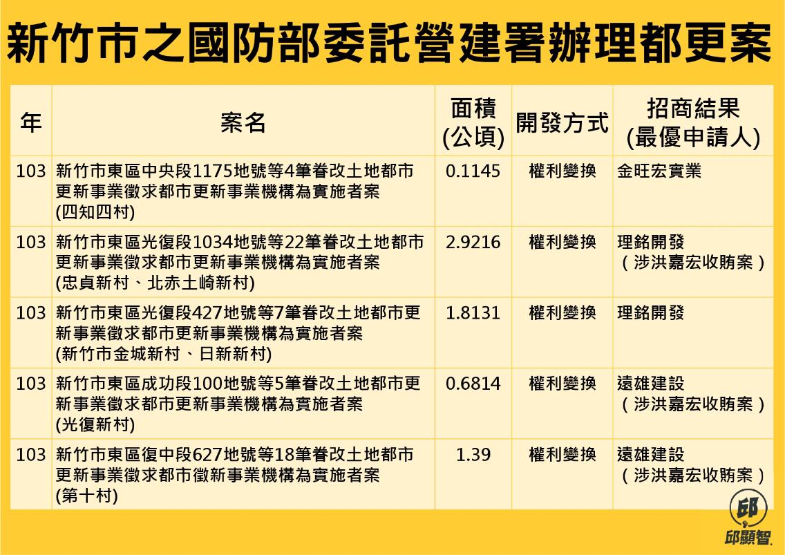 103年內政部營建署招商,只有理銘一家通過資格審查,最後也拿到這個案子,邱顯智直指,當時主辦都更招商的營建署城鄉分署長洪嘉宏,在106年因寡婦樓案收了昌益集團兩千萬賄款,以及在新竹另外兩個遠雄的都更案索賄四千五百萬被收押,在去年被台北地院依貪汙治罪條例判決8年2個月。
