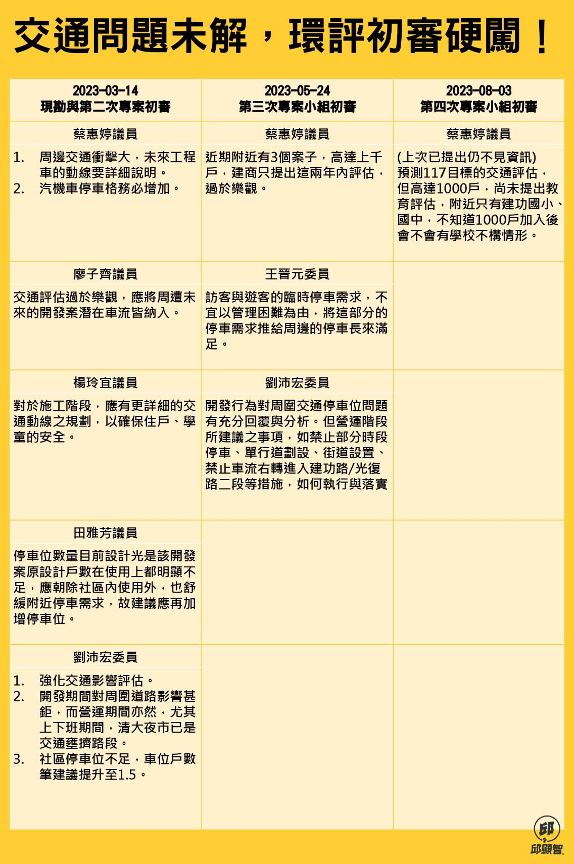 蔡惠婷則說,此開發案對於交通衝擊的評估過於樂觀,三次環評初審會,她與其他委員和出席者都一再強調,開發單位針對如此大規模的建案對清大夜市周邊交通的衝擊相當大,環評中眾多人提出提高汽機車位比例卻沒看到改善,勿將交通成本外部化,讓周邊雪上加霜。