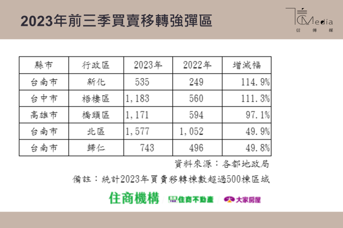 今年房市多空交錯,前三季六都買賣移轉棟數16萬8,173棟,跟去年同期相比年減10.3%,但還是有區域今年移轉量大幅優於去年同期,台南市新化區今年前三季移轉激增114.9%,台中市梧棲區也強升111.3%,今年前三季買賣移轉強彈區前五名中,台南市有3個行政區入榜。