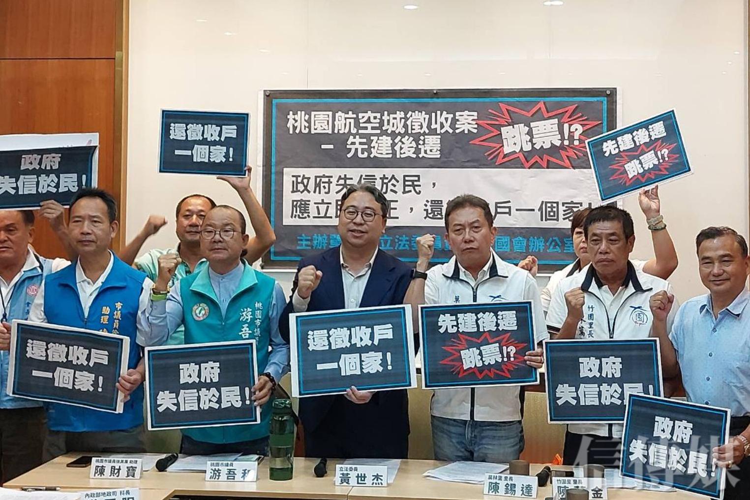 民進黨籍立委黃世杰今(5)日偕同多位桃園航空城徵收戶與徵收區里長等人前往立法院召開記者會,針對台灣史上最大土地徵收案的多項爭議,主要包含補償費未隨物價指數調整、安置住宅價格跳票以及安置街廓施工延宕等,要求政府正視徵收戶的困境,還給居民一個安身立命的家。