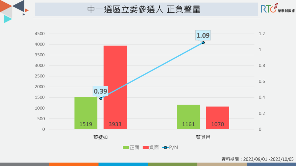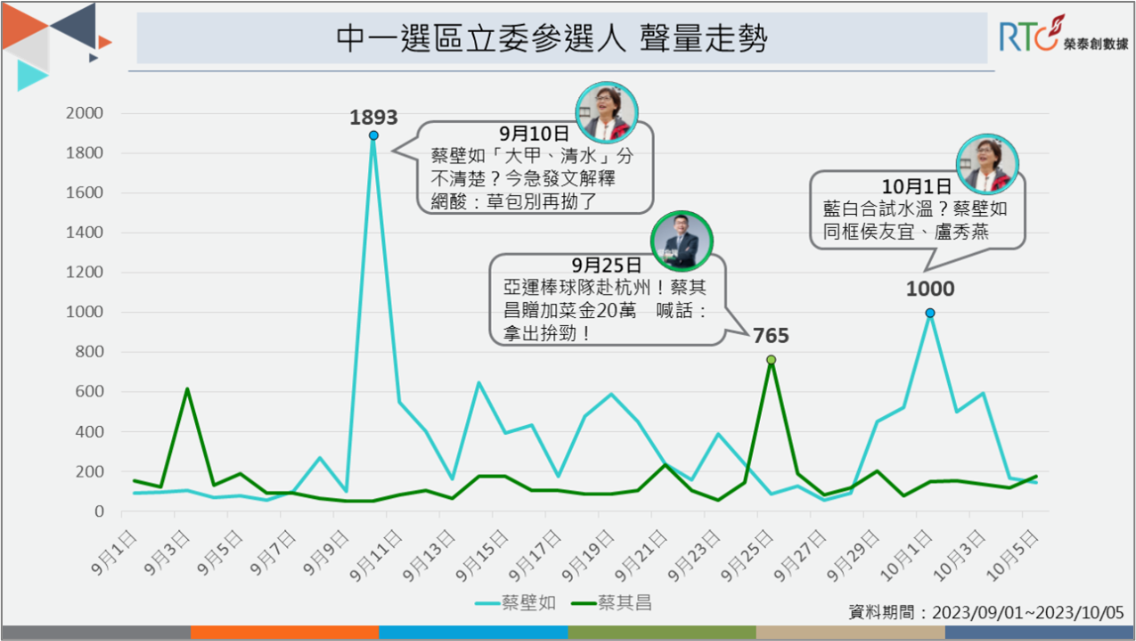 《榮泰創數據》分析近一個月兩位立委參選人的網路聲量,蔡壁如屢屢發動攻勢,創造多個聲量高峰,總聲量累計超過1.1萬則,對比蔡其昌的總聲量僅5千餘則,兩人聲量相差2倍,顯示蔡壁如在操作話題上更具主動性,能獲得網友討論關注。