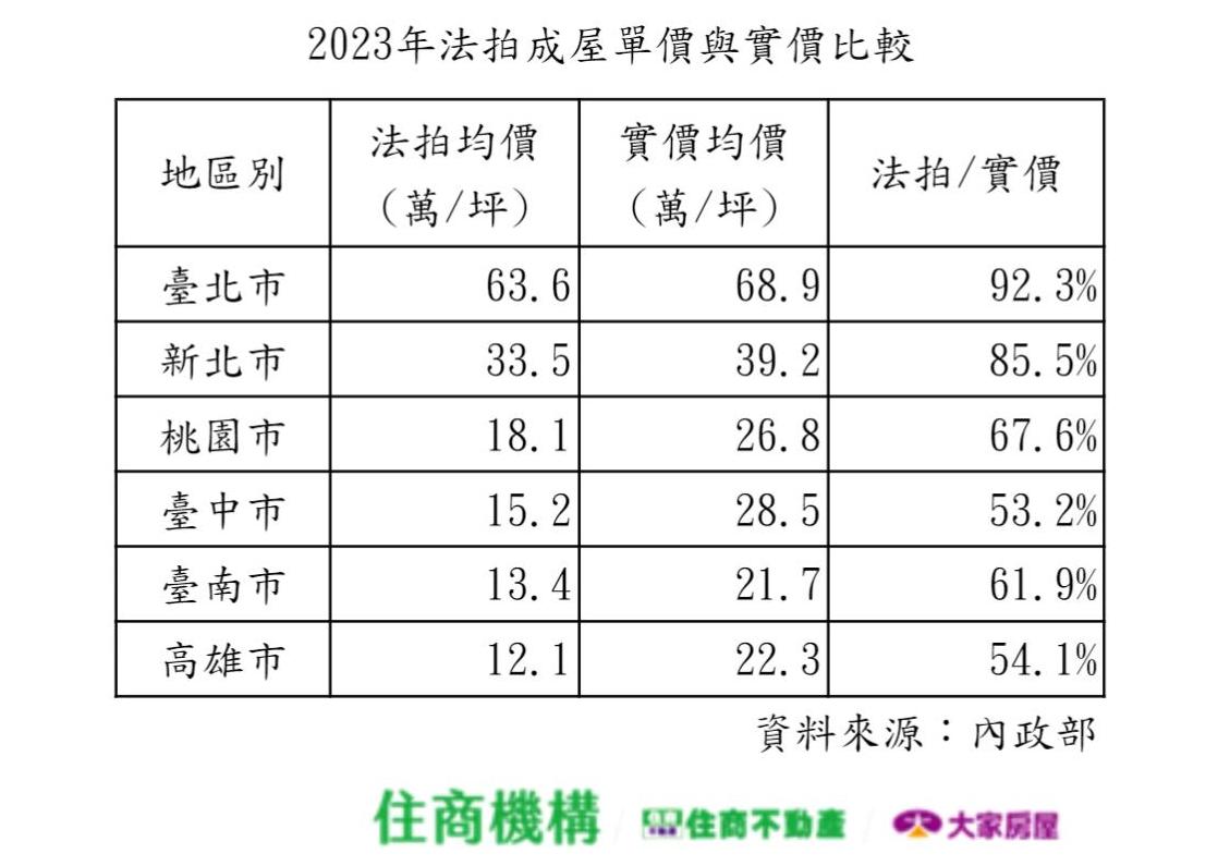 依據內政部法拍成屋均價與實價登錄均價相比,台中市及高雄市的價差最大,台中市法拍均價每坪15.2萬元、實價28.5萬元,法拍價格為實價的53.2%,高雄市法拍12.1萬元、實價22.3萬元,法拍為實價的54.1%,桃園市及台南市的法拍價格則相當於市價的6~7折,桃園市法拍均價每坪18.1萬元、台南市法拍13.4萬元,雙北的價差最少,台北市法拍平均63.6萬元,是實價的92.3%,新北市法拍33.5萬元,約實價的85.5%。