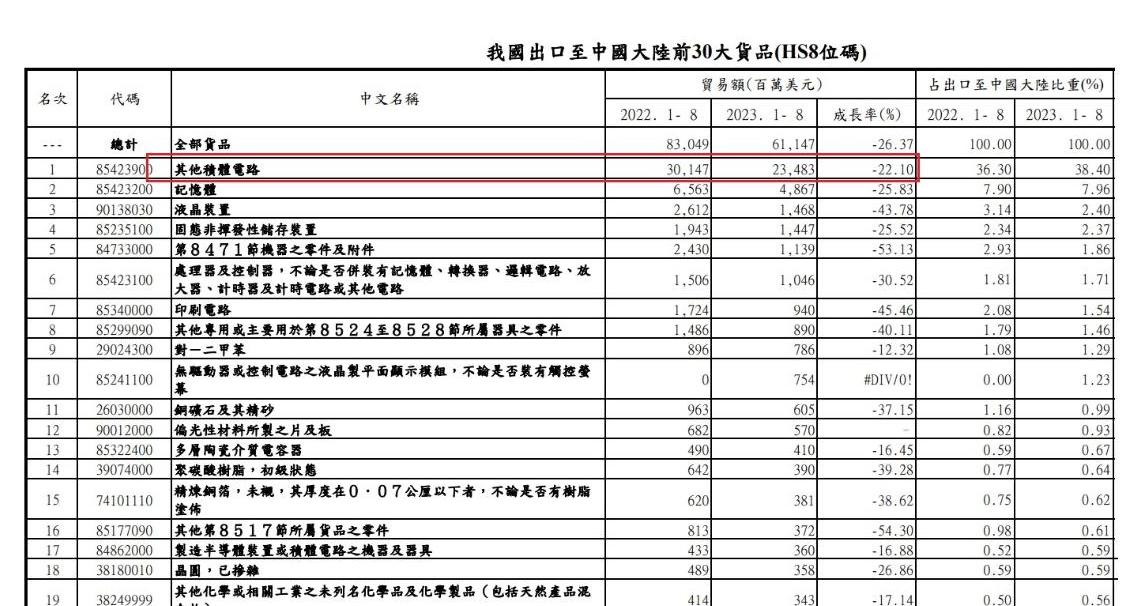 從國貿局的公告數據顯示,台灣每年對中國出口金額第一名是晶片,被稱之為「其它積體電路」,今年前8個月對中國出口金額234.83億美元(約7千4百多億台幣),第二名是記憶體的48.63億美元,第三名是面板,14.6億美元,顯然中國對台灣晶片仍然有龐大的需求。