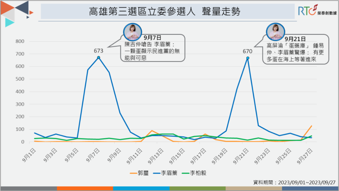 《榮泰創數據》分析近一個多月三位立委參選人的網路聲量,在9月上旬,李眉蓁與李柏毅的聲量差距懸殊,李眉蓁以超過4千則的聲量略為領先,李柏毅僅破8百則聲量、位居第二,郭璽則相對沒沒無聞,聲量未達5百則。