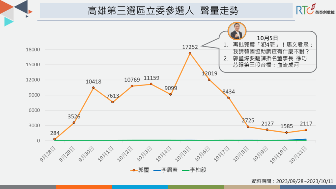 不過,從9月28日我國首艘國造潛艦海鯤號正式亮相後,曾經擔任海軍司令部顧問、同時也是軍火商的郭璽,指控國民黨立委馬文君外洩潛艦重要資料,雙方隔空較勁,洩密疑雲不斷延燒,郭璽聲量因而暴漲,在近半個月的時間累積近10萬則聲量,聲量更是逐日攀升,意外拉抬郭璽的人氣。