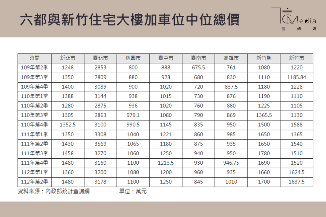 房價最高的仍是台北市,今年第二季電梯加上車位的中位總價為3178萬元,其次則是新竹縣的1700萬元,新竹市的1637.5萬元,新北市1480萬元,台中1250萬元,桃園市1100萬元,高雄1010萬元,房價最低的是台南市的845萬元。