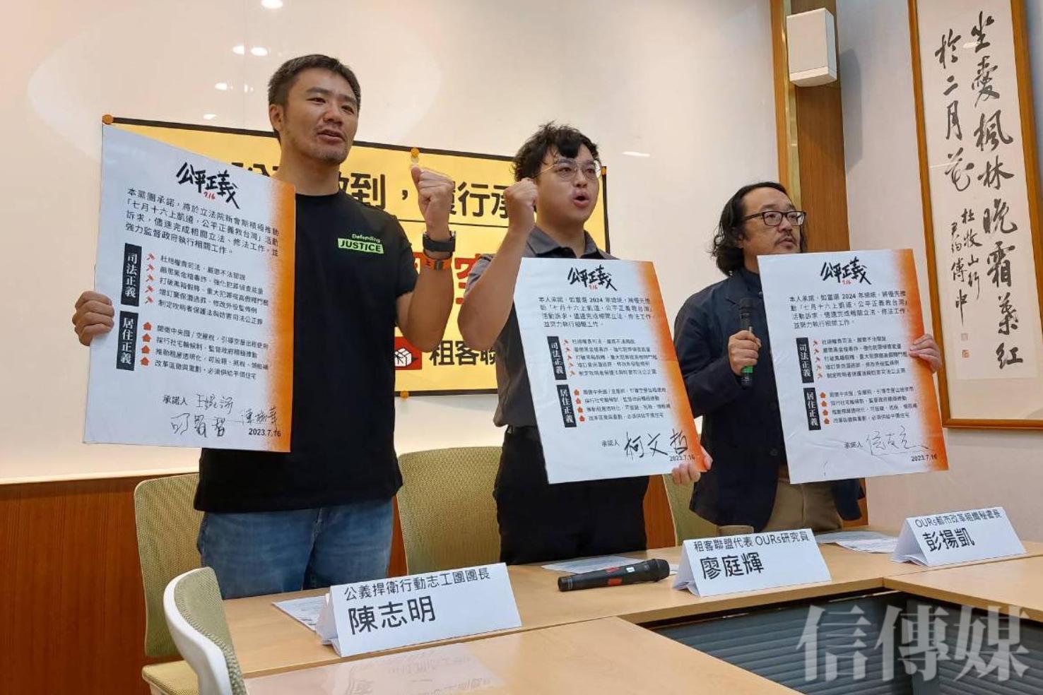 公義捍衛行動志工團團長陳志明表示,「中央囤/空屋稅」為716凱道行動核心訴求之一,出席各黨(時代力量、民眾黨、國民黨)與柯文哲、侯友宜兩位總統參選人皆明確承諾,並有簽名為證;但就據租屋聯盟側面了解,目前時代力量以及台灣民眾黨皆已研擬法案,即將提案送立法院審議,唯獨國民黨尚未「履行承諾」,嚴正呼籲國民黨團儘速提出,不要跟外界喊話與在立院的行動不一致,並責成國民黨籍財委會召委積極排審討論。