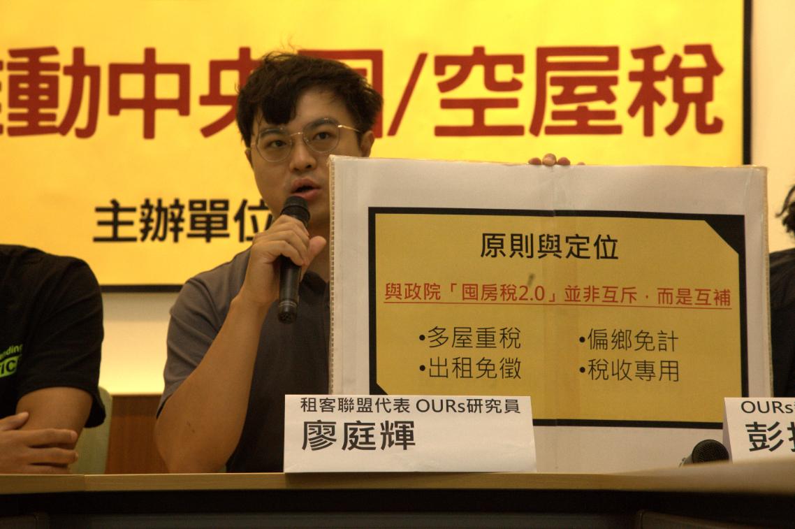租客聯盟代表廖庭輝表示,台灣空屋逾百萬,雖然中央已推行囤房稅2.0,但該法案對於空屋釋出的效用其實非常不樂觀,因此呼籲政府應該除了房屋稅(囤房稅2.0)外,還要增訂專門對付非自住且空閒之住宅課徵特別稅,以有效逼出空屋嫁入租賃市場,解決根本供需不足問題。
