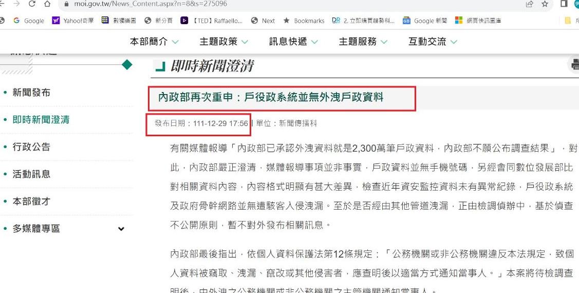 時代力量立委邱顯智2022年12月透過臉書發文說到,外洩的戶政資料筆數2357萬2055筆,且內政部已承認,2022年12月29日,內政部以標題「戶政系統並無外洩戶政資料」來否認。