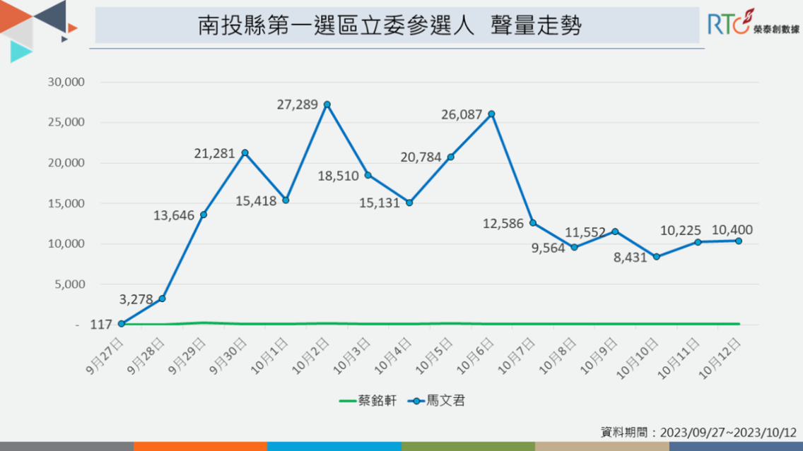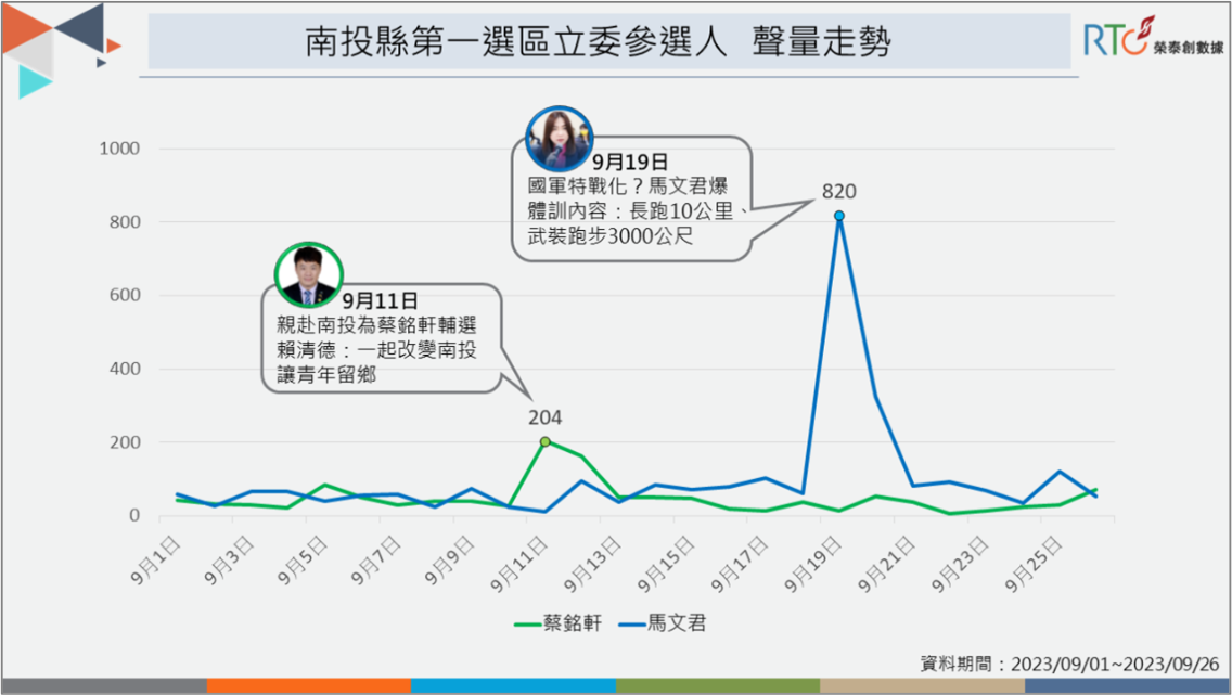 《榮泰創數據》分析近一個半月藍綠兩位立委參選人的網路聲量,以9月27日國造潛艦洩密案爆發為時間分線,馬文君在9月1日至26日之間的聲量達2.6千則,與蔡銘軒1.2千則,聲量相差2倍之多,顯示外界輿論關注馬文君的程度較高。