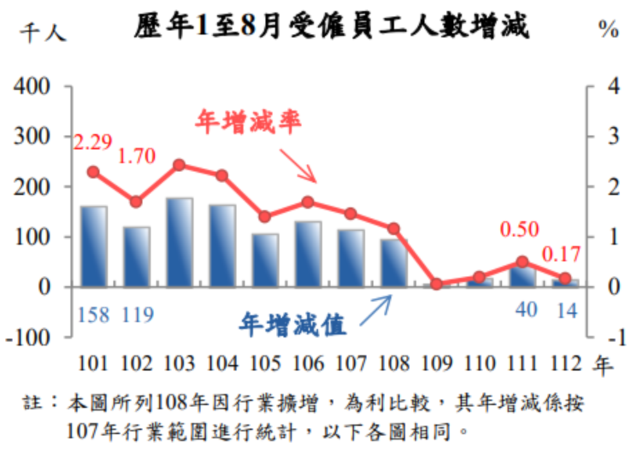 至於服務業部分,8月以住宿及餐飲業受雇人數減少4千人最多,主要則因暑期短期、臨時性工作結束影響。