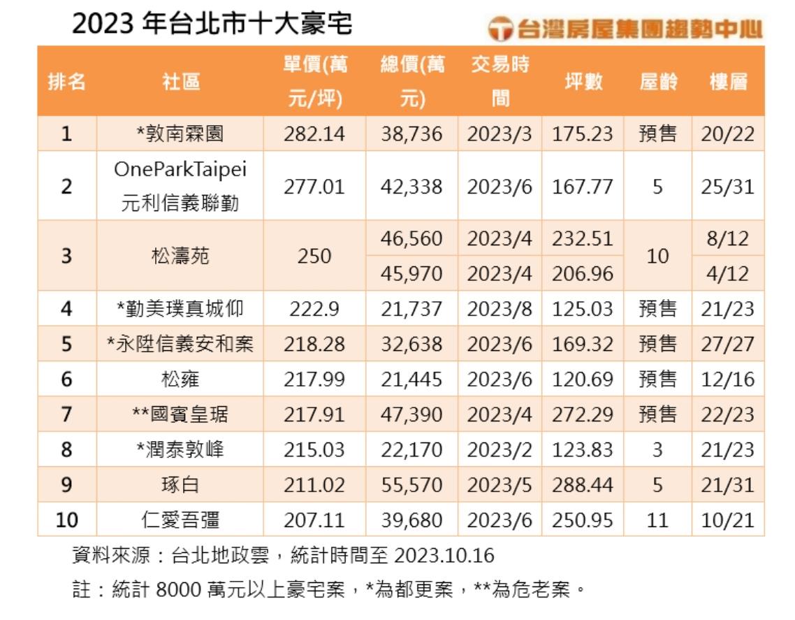 台灣房屋集團趨勢中心執行長張旭嵐表示,目前台北2023年的前十名預售與成屋豪宅,單價都站上200萬元以上,且十大豪宅當中,有一半是都更危老改建的個案,顯示近年台北積極進行舊樓改建,精華地段、基地面積大的標的,讓開發商選擇規劃豪宅等級的預售案。截至目前為止,今年的十大豪宅當中,改建預售案「敦南霖園」、「勤美璞真城仰」、「永陞信義安和案」、「國賓皇琚」等都進入榜單,而這四宗預售豪宅案,均為老屋改建案例,前三者屬於都更案,「國」案則是危老案,四案的高樓層單價落在217.91~282.14萬元之間,成交坪數都在120坪以上。