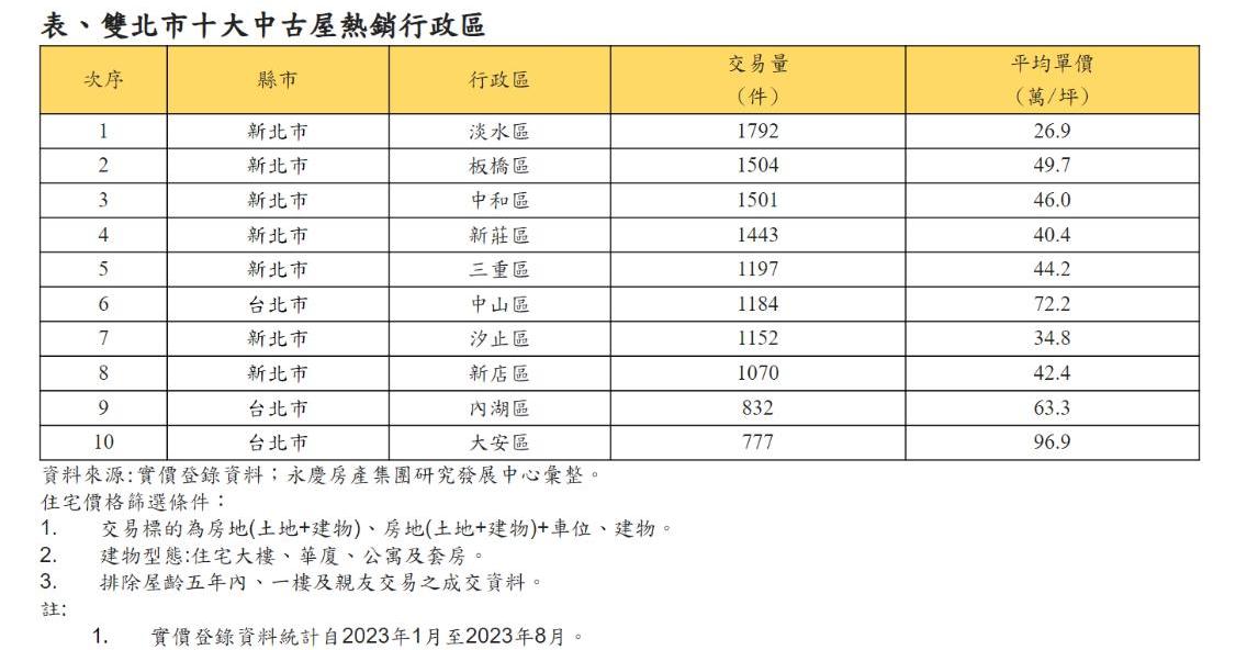 相較於新成屋,中古屋具備公設較低、價格相對親民以及地段優質等優勢,是不少購屋族的首選,此次永慶房產集團透過實價登錄,盤點雙北地區屋齡超過5年的中古屋交易,篩選出最為熱銷的十大區域。其中,新北市淡水區以交易量1792件奪冠,若看雙北市交易熱區的分布,新北市搶下7個席次,台北市僅中山區、內湖區與大安區3個行政區上榜。