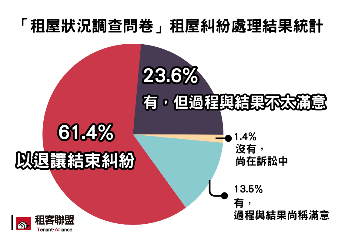 同時據崔媽媽基金會統計,今年截至9月止,租屋糾紛諮詢已超過2千件,其中最大宗的糾紛類別為「提前終止租約」;租客聯盟的問卷則顯示「修繕問題」與「押金返還問題」亦為糾紛主要來源。