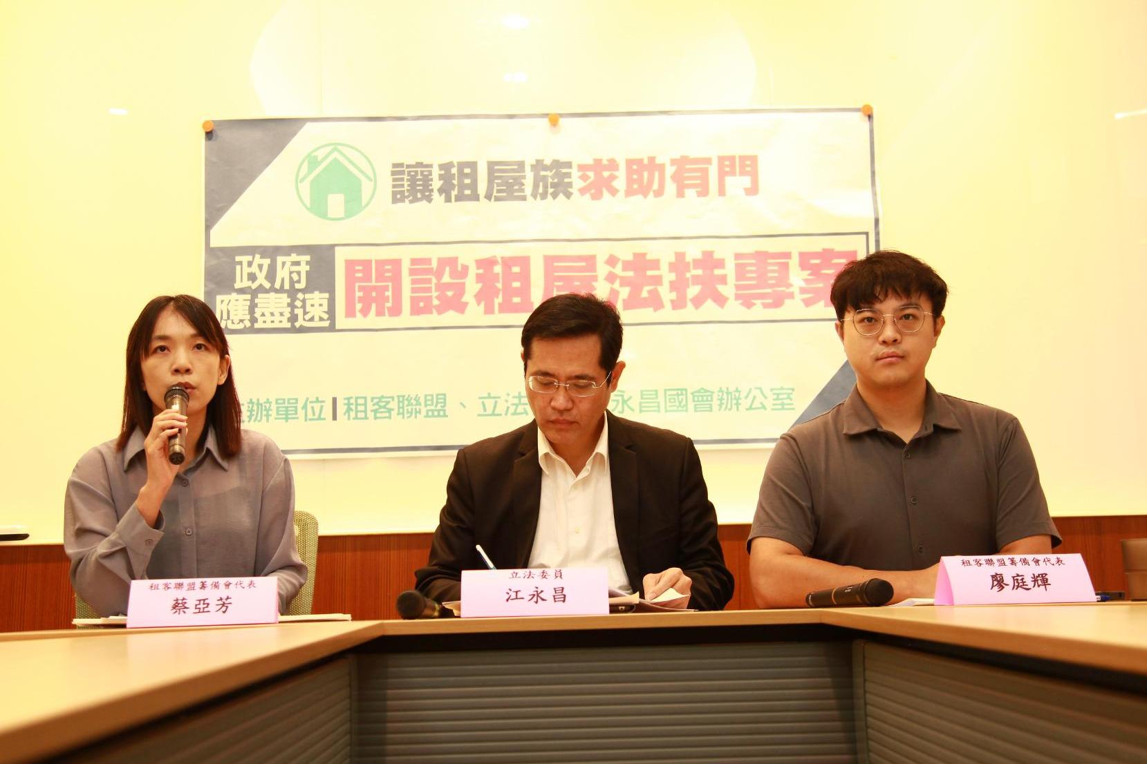 租屋聯盟與民進黨籍立委江永昌在記者會中表示,由於長年租屋黑市與法規不彰,租屋族面對租屋糾紛時往往面對多處困境,例如相關單位互踢皮球、修法後配套不足等問題,讓租屋族求助無門,最後多數只能吃虧認賠,因此呼籲政府應開設「租屋法律扶助專案」,讓百萬租屋族面對糾紛時能夠「求助有門」。