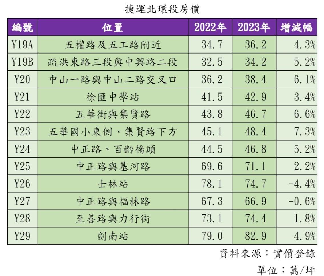 北捷日前宣布環狀線北環段開工,完工通車後大幅縮短雙北通勤時間,大幅提升大眾運輸效能與區域機能,依據實價資料,沿線各站今年房價多數呈上揚走勢,其中位在新北市三重區的Y22及Y23站成長最多,年增幅分別有6.6%及7.3%。大家房屋企劃研究室總監郎美囡表示,北環段沿線各站多為生活機能成熟區域,市場轉冷仍有自用買盤撐場,未來又有軌道經濟可期待,故房價發展穩定。