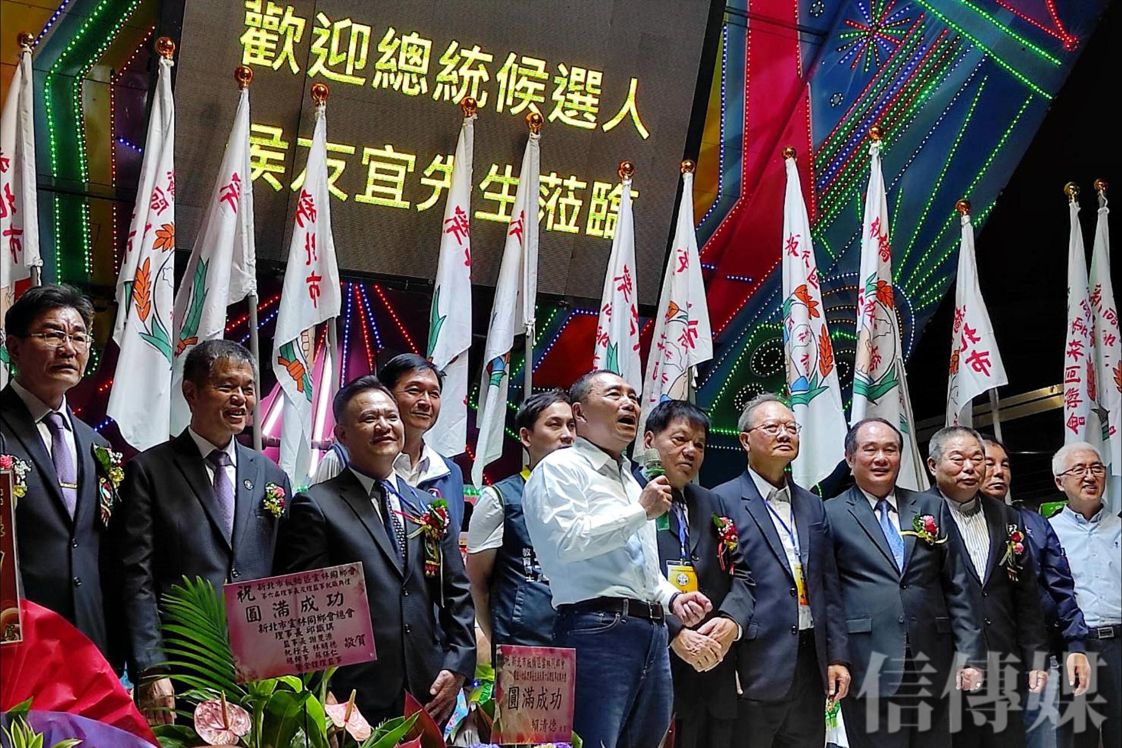 或許是嗅到精神領袖的風向,侯友宜昨晚6時30分進場時,雲林同鄉會幹部幾乎全體列隊歡迎,並組織姊姊大旗隊引領大進場,同時也出動新北戰警大旗隊共同簇擁著侯進場,主辦方的電子看板並秀出「歡迎總統候選人侯友宜先生蒞臨」,架式相當氣派。
