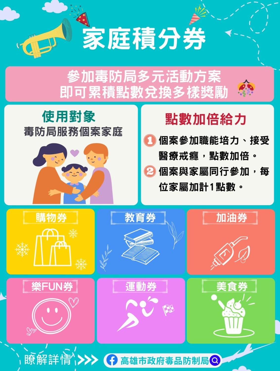 高雄市政府毒品防制局為有效促進藥癮者復歸社會,特別汲取冰島家庭福利政策模式精神,首創推出「家庭積分券~提升藥癮者家庭支持功能方案」,主要透過藥癮者與家屬共同參與毒防局多元輔導活動,包括「愛與陪伴」社區支持團體、心理諮商輔導、家庭日系列活動、「螢火蟲家族」培訓、藥癮者家庭支持據點服務活動等,可集點兌換教育券、購物券、美食券、加油券、樂FUN券、運動券等多樣獎勵。